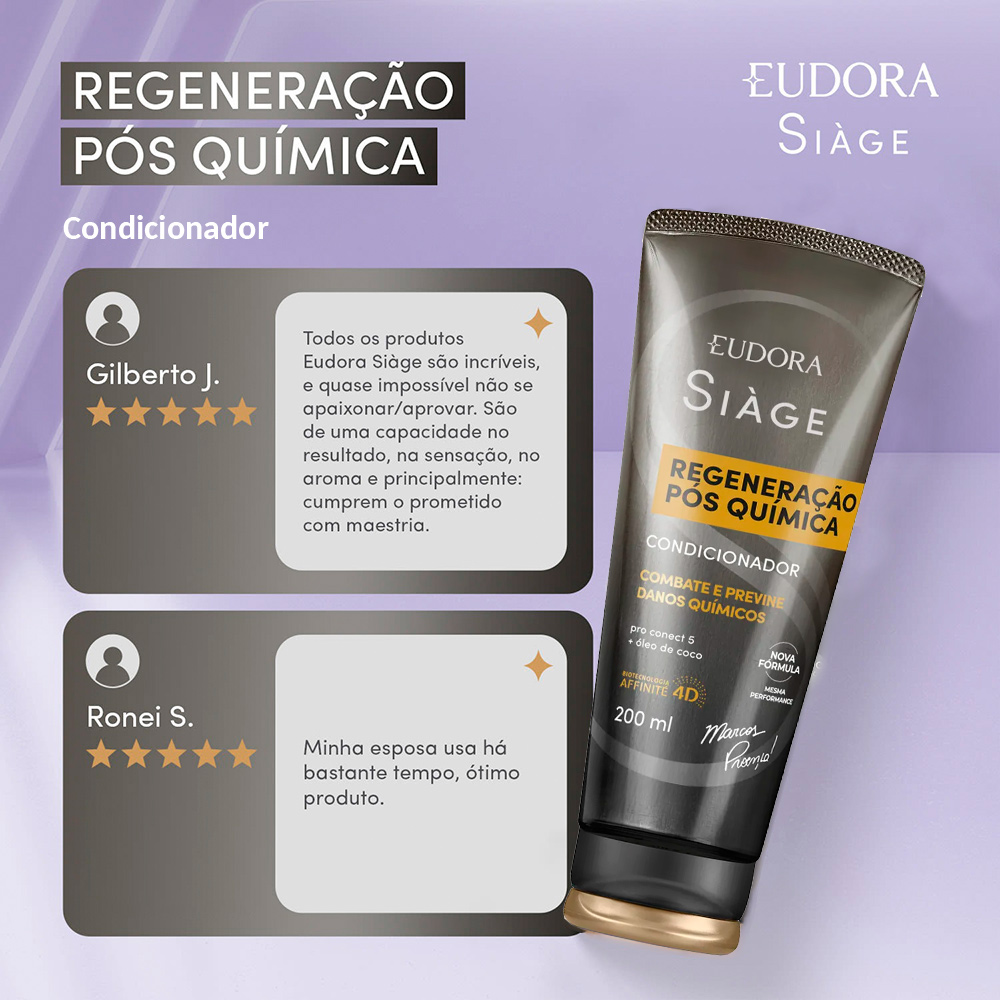 A linha Siàge Regeneração Pós Química é assinada pelo expert Marcos Proença, e traz o complexo tecnológico Pro Conect 5 + Óleo de Coco que promove o religamento das pontes capilares dos fios ressecados e quebrados por agressões químicas, garantindo uma linha completa de resultados de salão para seus cuidados capilares diários.
