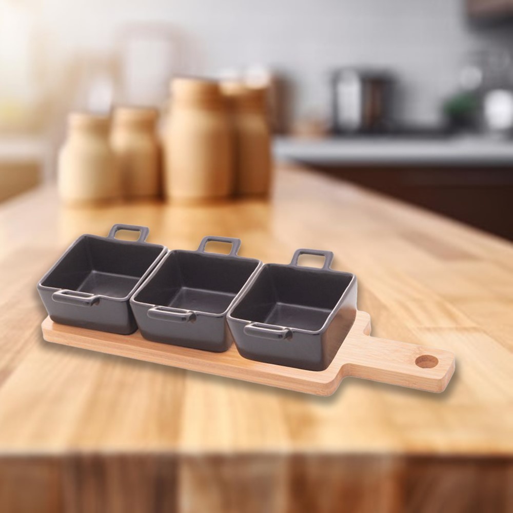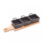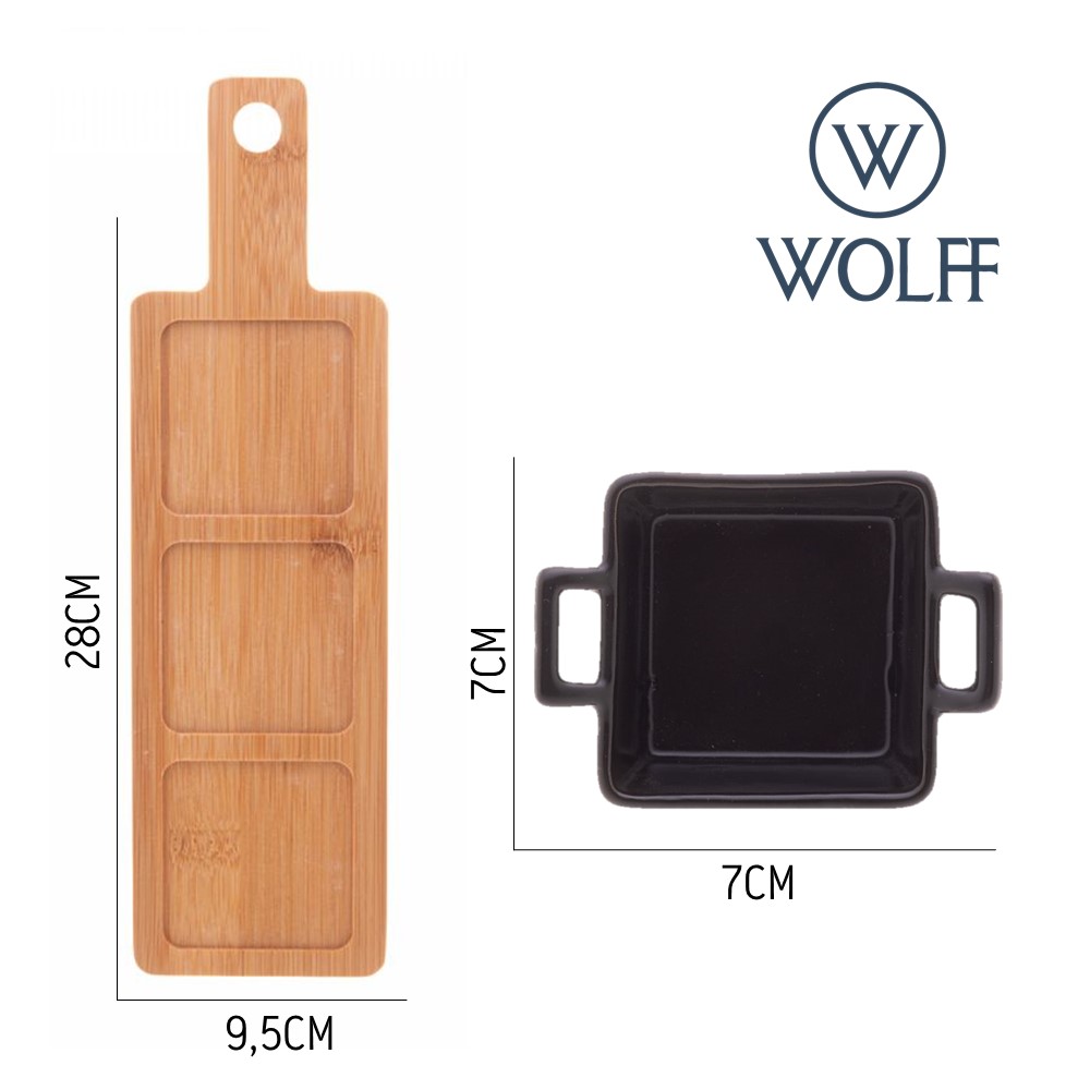 Apresente seus petiscos com estilo e praticidade usando o Conjunto Bandeja de Bambu com 3 Petisqueiras Quadradas de Porcelana Preta da Wolff. Este conjunto combina a beleza natural do bambu com a elegância da porcelana preta, criando uma apresentação encantadora para seus petiscos.