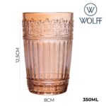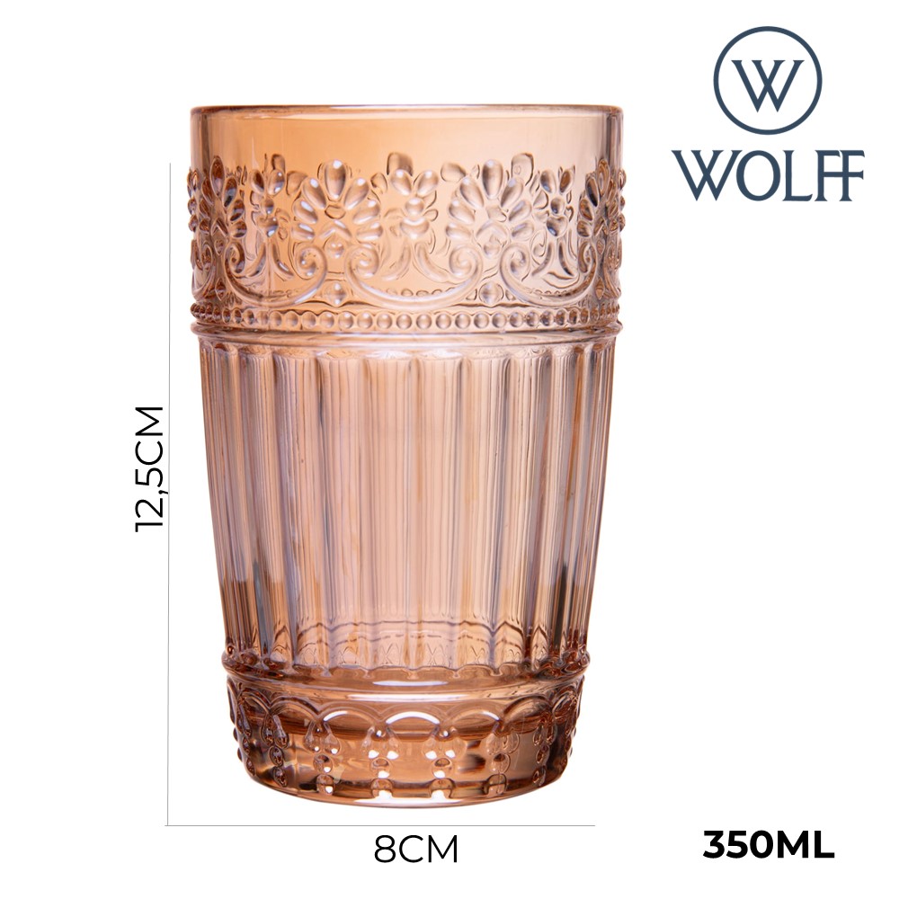 O Copo Mauve da Wolff, com capacidade de 350ml e coloração âmbar, é fabricado em cristal ecológico. O material garante a pureza da cor e a durabilidade da peça, além de ser uma opção mais sustentável na produção de utensílios de vidro.