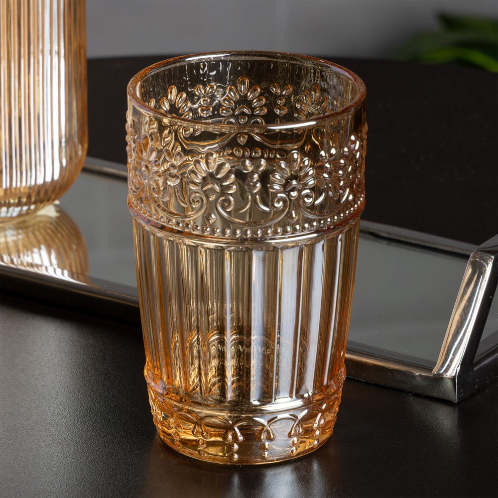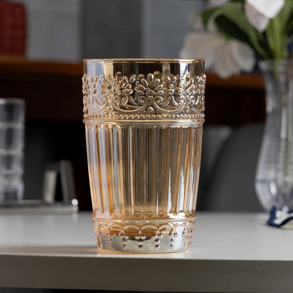 A tonalidade âmbar do cristal confere um toque diferenciado à composição da mesa, sendo adequada tanto para uso cotidiano quanto em ocasiões especiais. O design do copo equilibra estética e funcionalidade, proporcionando uma experiência agradável ao degustar diferentes tipos de bebidas.