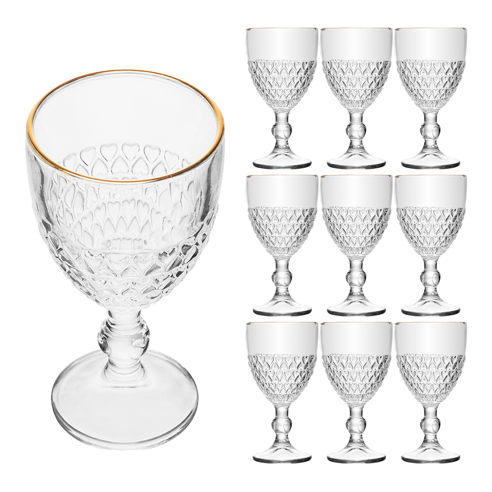 Jogo 10 Taça com Borda Dourada Coração Vidro Cor Transparente Fio de Ouro para Água 320ml Lyor