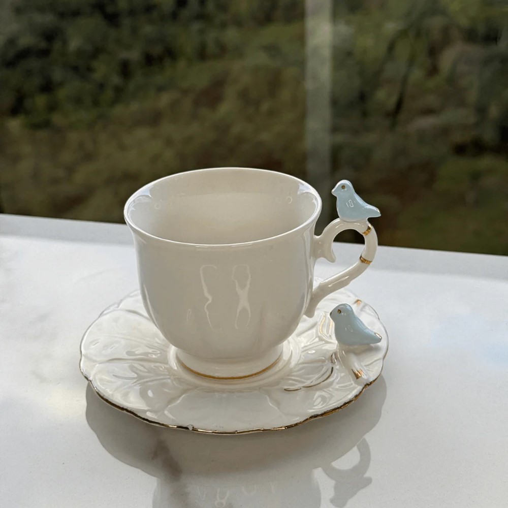 Cada xícara e pires foram fabricados em porcelana resistente e possuem lindos detalhes azul que encantam os delicados passarinhos na alça da xícara e no pires;