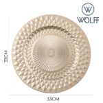 O sousplat serve como base para pratos, protegendo a toalha de mesa e adicionando um toque estético à composição da mesa. Este modelo Roman, da Wolff, possui 33cm de diâmetro e é confeccionado em plástico resistente, o que facilita a limpeza e oferece durabilidade para uso frequente. A cor dourada proporciona um visual elegante e sofisticado, adequado para eventos formais ou para agregar um toque de requinte ao dia a dia.