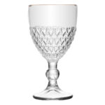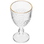 Taça para servir água ou outras bebidas, com capacidade de 320ml. Fabricada em vidro transparente com detalhes em relevo no formato de corações, que adicionam textura e diferencial visual à peça. A borda superior é finalizada com um delicado fio de ouro, conferindo um toque refinado.