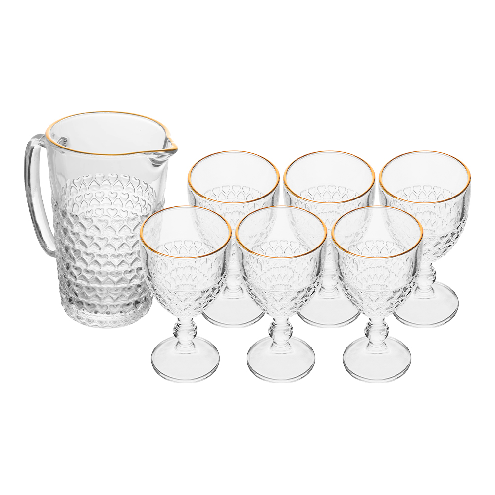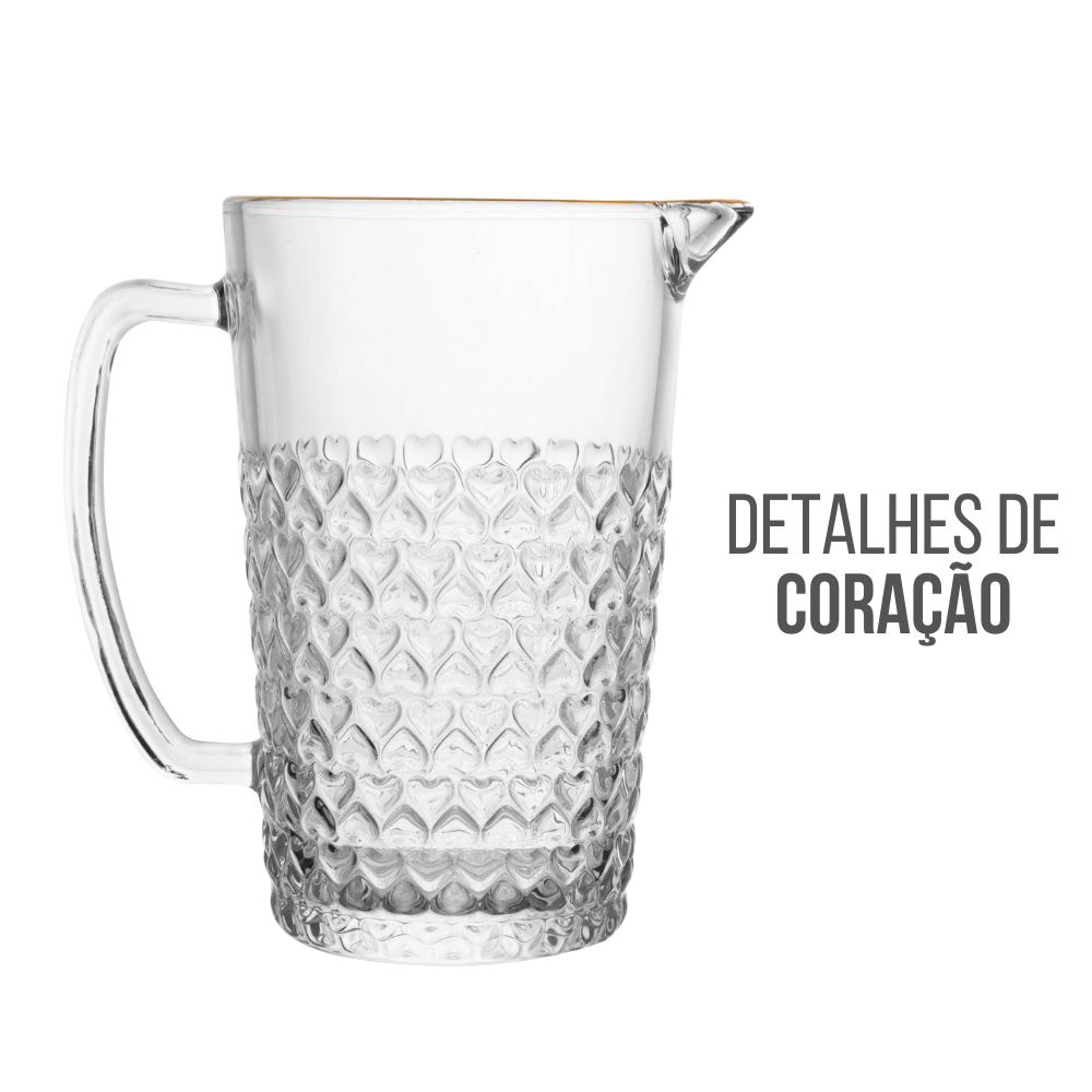 Jogo de Taças com Jarra Coração 7 Peças Borda Dourada Fio Dourado Vidro Transparente 1L 320ml Lyor