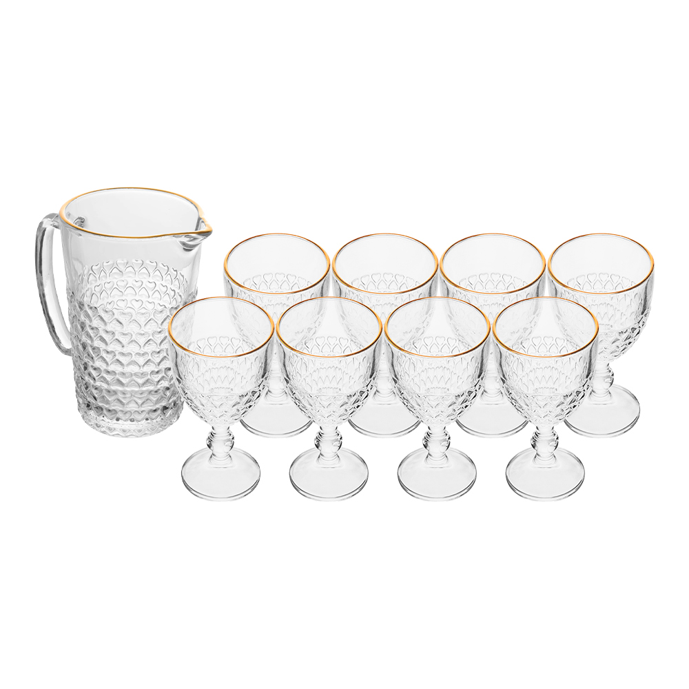 Jogo de Taças com Jarra Coração 9 Peças Borda Dourada Fio Dourado Vidro Transparente 1L 320ml Lyor