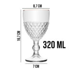 A jarra possui formato que facilita o manuseio e o serviço das bebidas, enquanto as taças contam com uma base que proporciona estabilidade, reduzindo o risco de derramamentos. O vidro utilizado na fabricação não interfere no sabor das bebidas, assegurando que as características originais sejam preservadas. Recomenda-se a lavagem manual para preservar os detalhes em dourado.