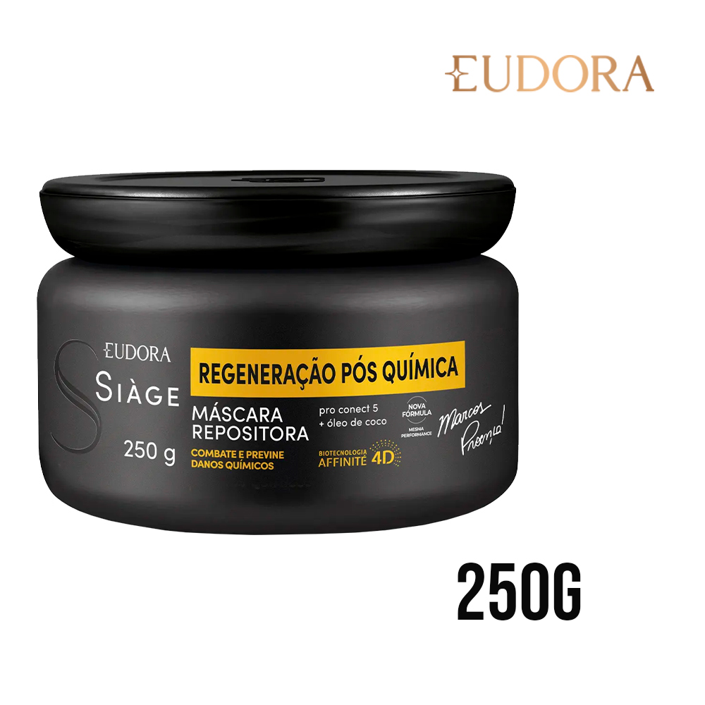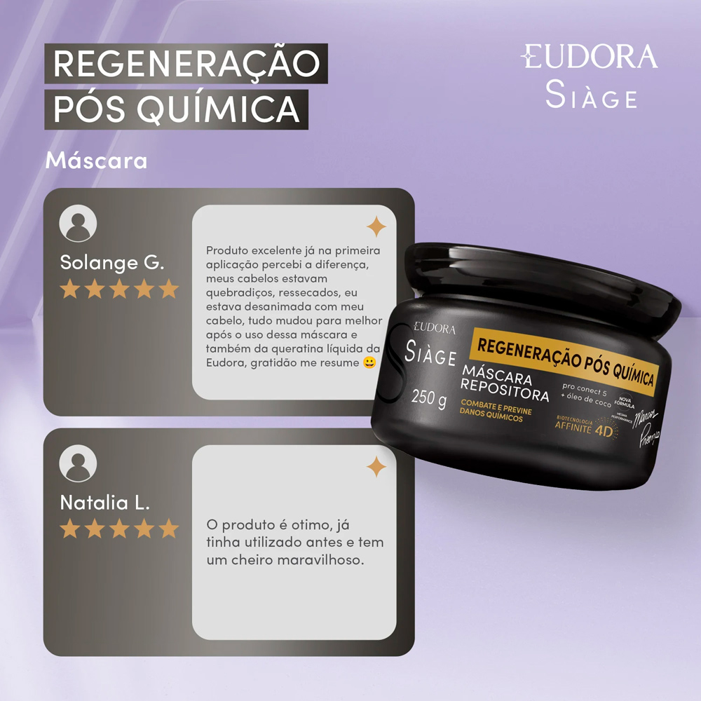 A Máscara Capilar Siàge Expert Regeneração Pós Química, da Eudora, é formulada para a recuperação intensiva de cabelos que passaram por processos químicos. A composição inclui o complexo Pro Conect 5 e óleo de coco, ingredientes que auxiliam no religamento das pontes capilares, contribuindo para a restauração da estrutura capilar danificada.