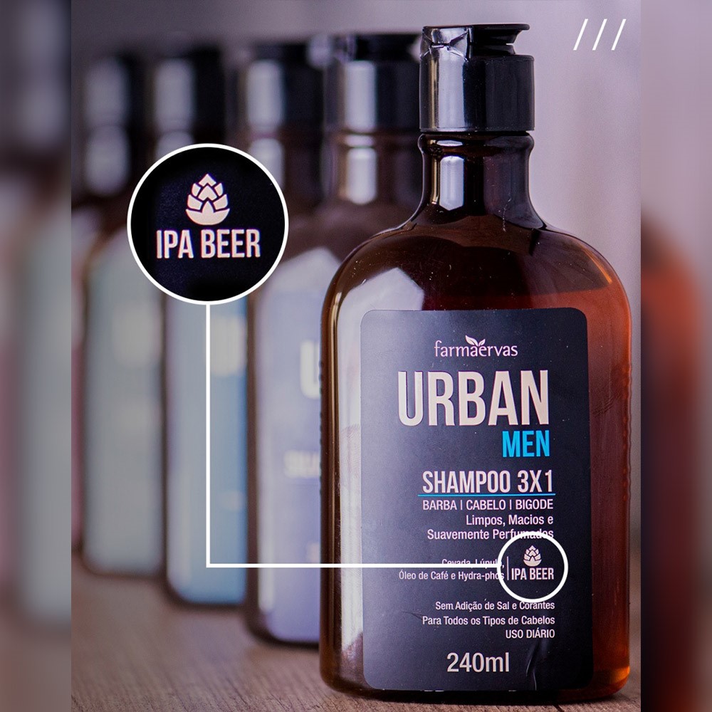 O Shampoo 3×1 Urban Men limpa seu cabelo, barba e bigode com praticidade. Sua fórmula traz os ingredientes das melhores cervejas IPA’s do mundo para oferecer um cuidado rápido, eficaz e com perfume extremamente agradável. Fórmula livre de sal e corantes.
