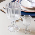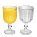 O corpo da taça possui ranhuras verticais que oferecem uma superfície texturizada, auxiliando na aderência durante o manuseio e contribuindo para disfarçar impressões digitais, o que ajuda a manter a clareza visual. A estrutura com pé e haste assegura estabilidade em diferentes superfícies e permite segurar o recipiente sem transferir o calor da mão para a bebida, auxiliando na manutenção da temperatura do líquido.