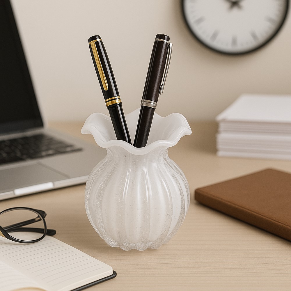 O vaso decorativo em Vidro Murano é ideal para acomodar arranjos florais, plantas de pequeno porte ou como peça de destaque individual. A técnica de produção artesanal, com vidro soprado, resulta em um objeto único, com variações sutis que atestam sua autenticidade. O acabamento translúcido branco permite a passagem de luz, valorizando a cor e as texturas, enquanto as bolhas internas proporcionam um efeito visual diferenciado.