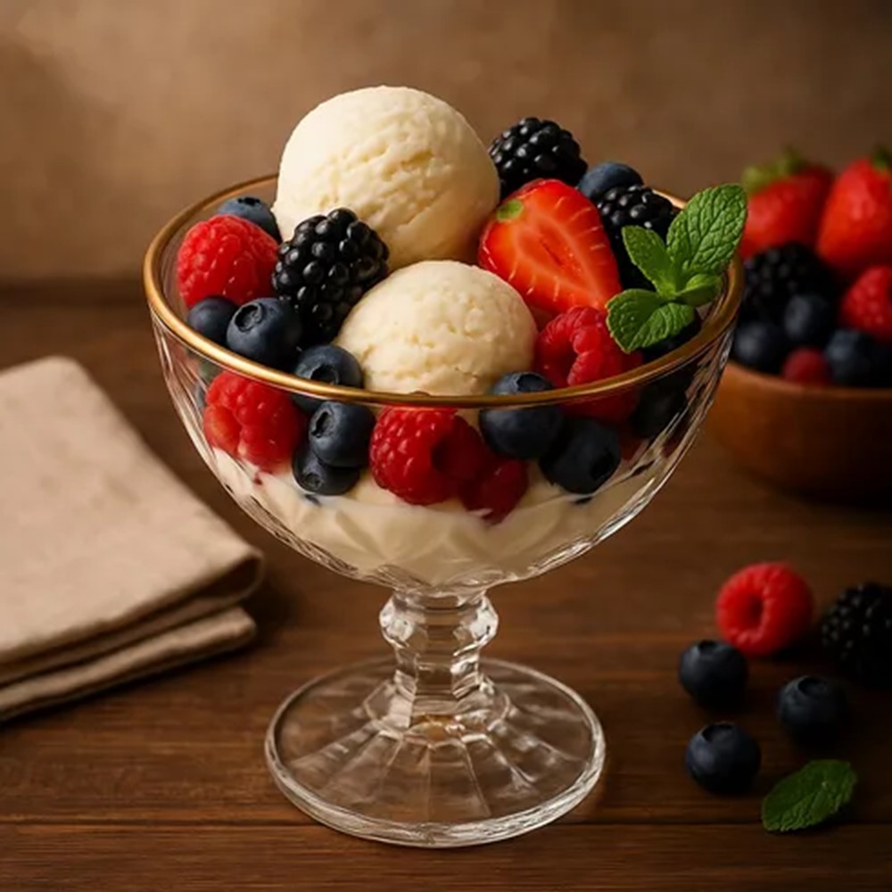 O material em vidro utilizado na confecção contribui para a durabilidade da peça em uso frequente. A capacidade de 250ml acomoda porções individuais de sobremesas variadas, como mousses e sorvetes. O acabamento com fio dourado na borda complementa a estética do produto. A peça é adequada para compor a mesa em diferentes contextos.