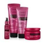 Este kit Siàge Cauterização dos Fios Eudora oferece um tratamento completo para reconstrução capilar, ideal para cabelos secos e ressecados. O conjunto inclui shampoo, condicionador, sérum e máscara capilar, formulados com aminoácidos e colágeno. Esses componentes atuam no preenchimento de áreas fragilizadas dos fios, uniformizando a textura e restaurando a barreira natural, o que protege contra danos futuros.