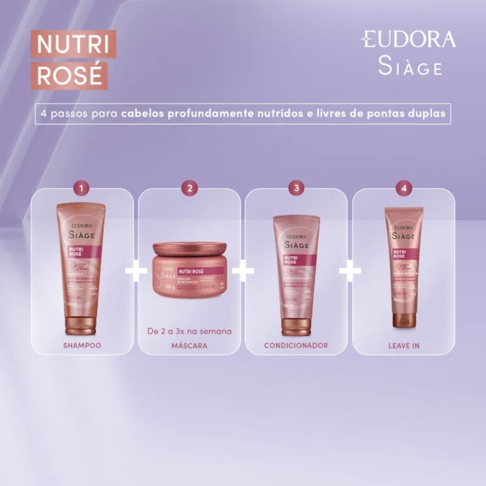 Este kit oferece um tratamento completo de nutrição capilar com a Máscara Nutri Rosé e seu respectivo refil. A máscara atua na hidratação profunda e reparação das áreas fragilizadas da fibra capilar, desde a raiz até as pontas, minimizando a necessidade de cortes frequentes.