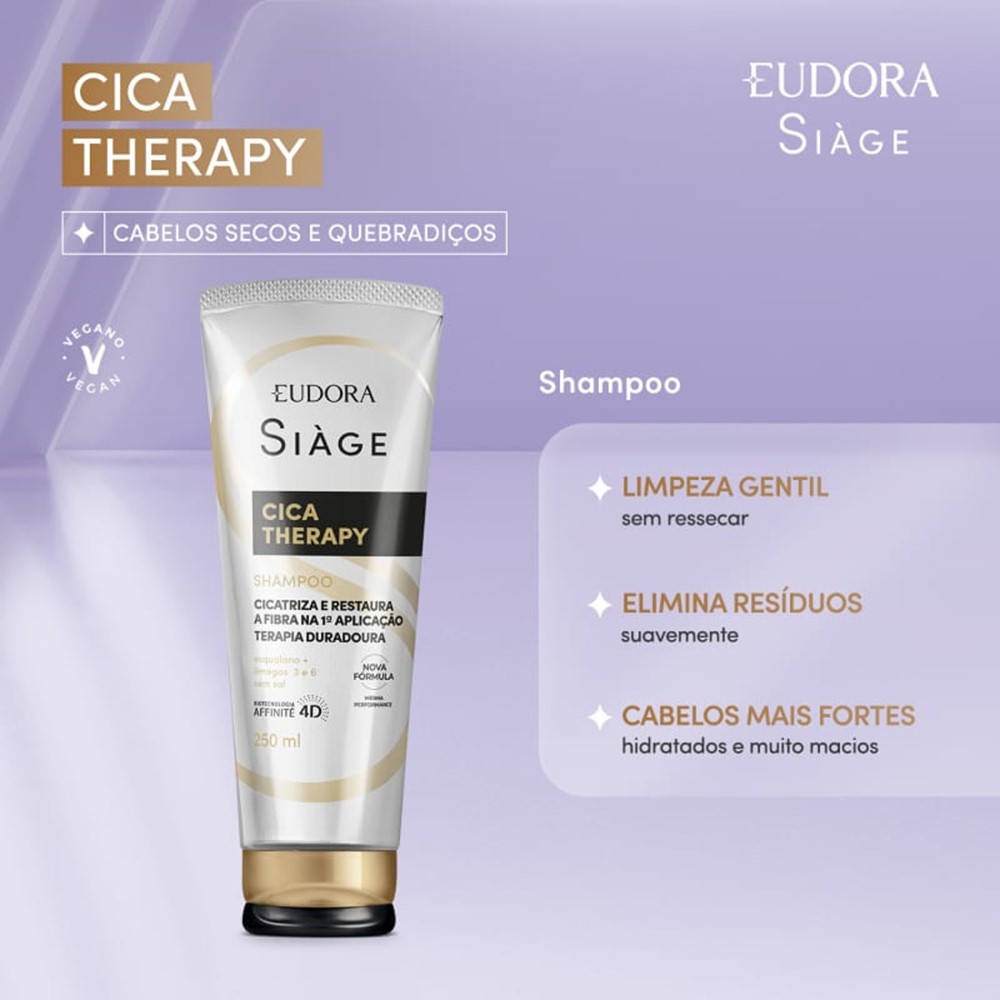 A formulação dos produtos Siàge Cica-Therapy, enriquecida com Esqualano e Ômegas 3 e 6, atua na recuperação da fibra capilar, repõe nutrientes essenciais e protege contra agressões externas. A biotecnologia Affinité 4D presente nos produtos auxilia na identificação e tratamento de danos nas camadas mais profundas dos fios, promovendo resultados visíveis desde a primeira aplicação.