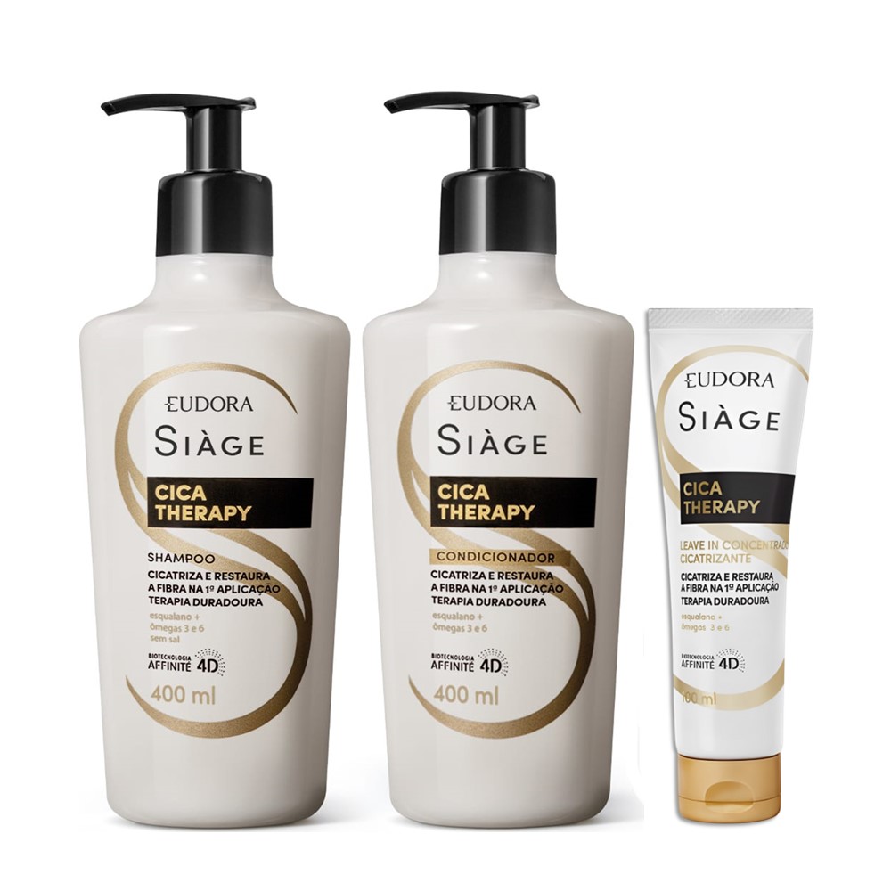 Este kit Siàge Cica-Therapy Eudora oferece um tratamento completo para a recuperação capilar, composto por shampoo, condicionador e leave-in. O shampoo promove a limpeza suave dos fios sem ressecar, enquanto o condicionador facilita o desembaraço e promove hidratação desde a fibra capilar. O leave-in, com alta concentração de ativos, atua na correção das cutículas e redução das pontas duplas, além de oferecer proteção térmica de até 230°C.