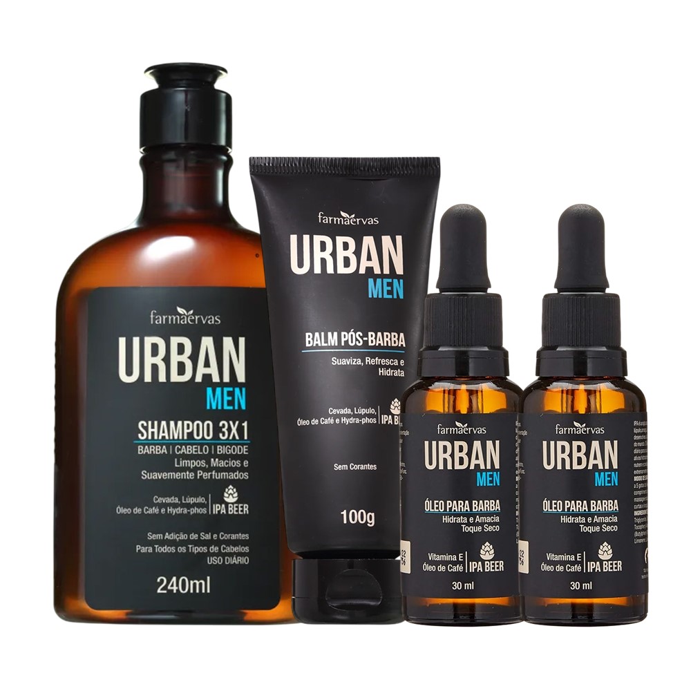 Kit Shampoo Masculino 3×1 Balm Hidratante Pós e 2 Óleos para Barba Urban Men