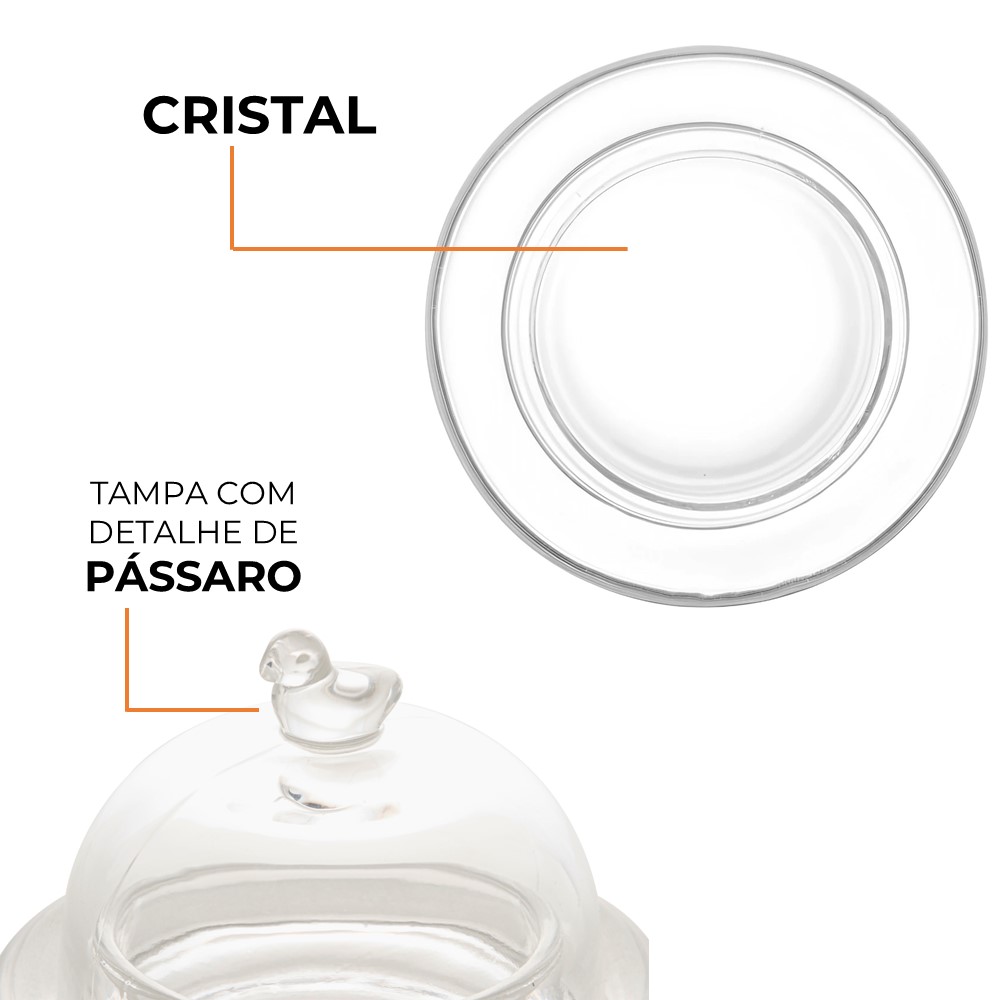 A Manteigueira de Cristal da Lyor é essencial para uma mesa elegante! Produzida com cristal de alta qualidade, é resistente, com acabamento impecável e excelente vedação para os alimentos. Seu charme reside no pegador de Pássaro, tornando o momento de servir único e sofisticado.