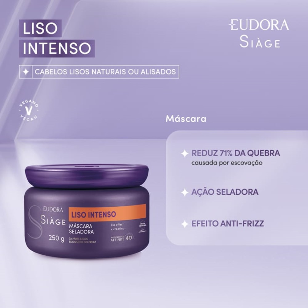 Eudora Siàge Liso Intenso possui fórmula inteligente que se adequa a lisos naturais, alisados ou com ondas indesejadas, proporcionando liso extremo por muito mais tempo. Seus produtos entregam hidratação, cuidados diários, cabelos 2x mais lisos e bloqueio do frizz.