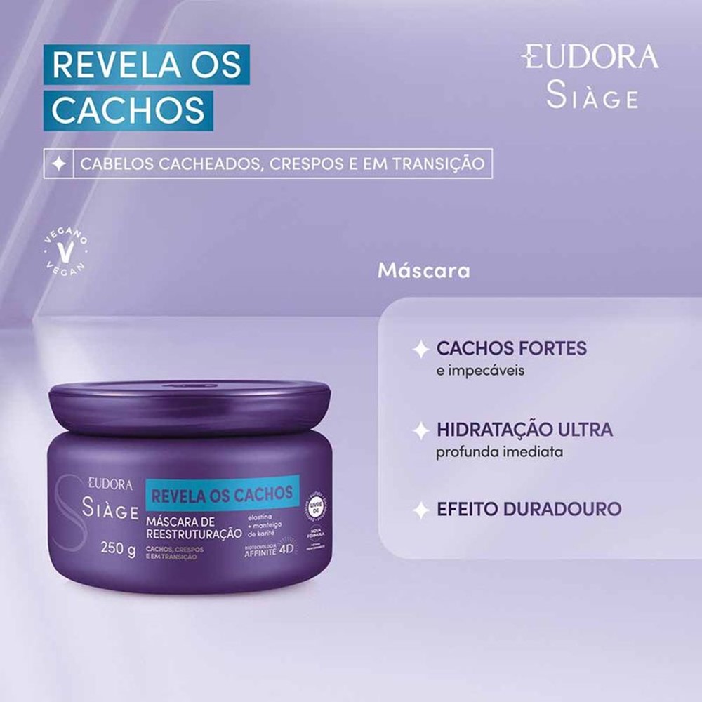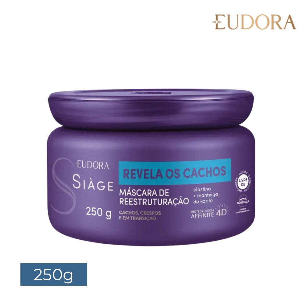 Ideal para o cronograma capilar hidratação, a Máscara de Reestruturação Eudora Siàge Revela os Cachos promove uma reestruturação completa nos cabelos cacheados, ondulados, crespos e em transição. Sua fórmula com Elastina e Manteiga de Karité possui tecnologia inteligente que reconhece os pontos de torção do fio, entregando o tratamento ideal para todos os tipos de curvatura.