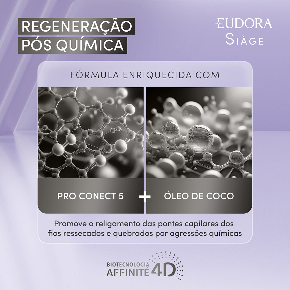 A Máscara Capilar Siàge Expert Regeneração Pós Química, da Eudora, é formulada para a recuperação intensiva de cabelos que passaram por processos químicos. A composição inclui o complexo Pro Conect 5 e óleo de coco, ingredientes que auxiliam no religamento das pontes capilares, contribuindo para a restauração da estrutura capilar danificada.