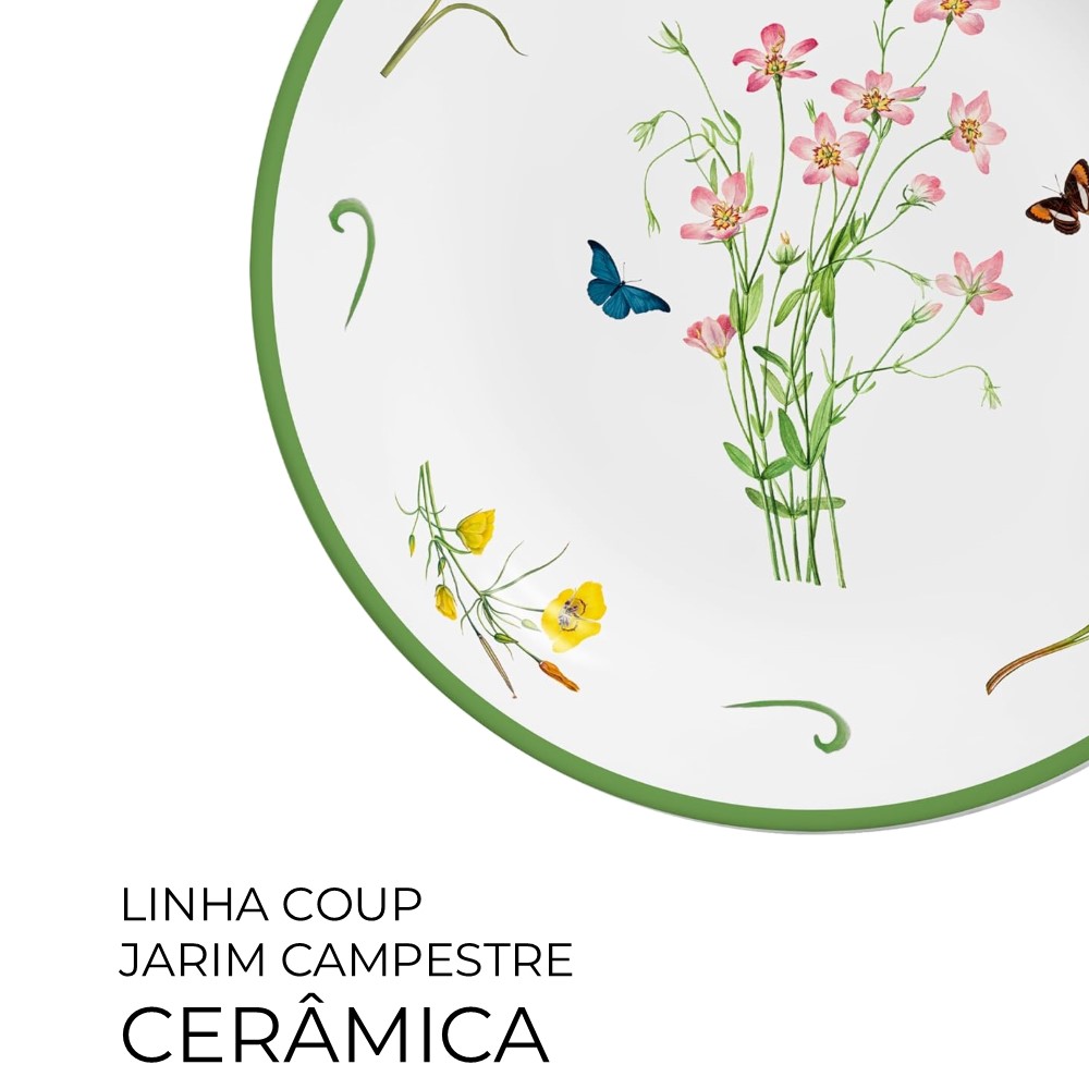 O Prato Raso Coup Jardim Campestre Alleanza, com 29 cm de diâmetro, é produzido em cerâmica branca de alta resistência. A decoração é aplicada por processo digital, conferindo um acabamento preciso e detalhado. Apropriado para servir sobremesas, petiscos ou pequenas porções, este prato adiciona um toque de elegância à mesa.