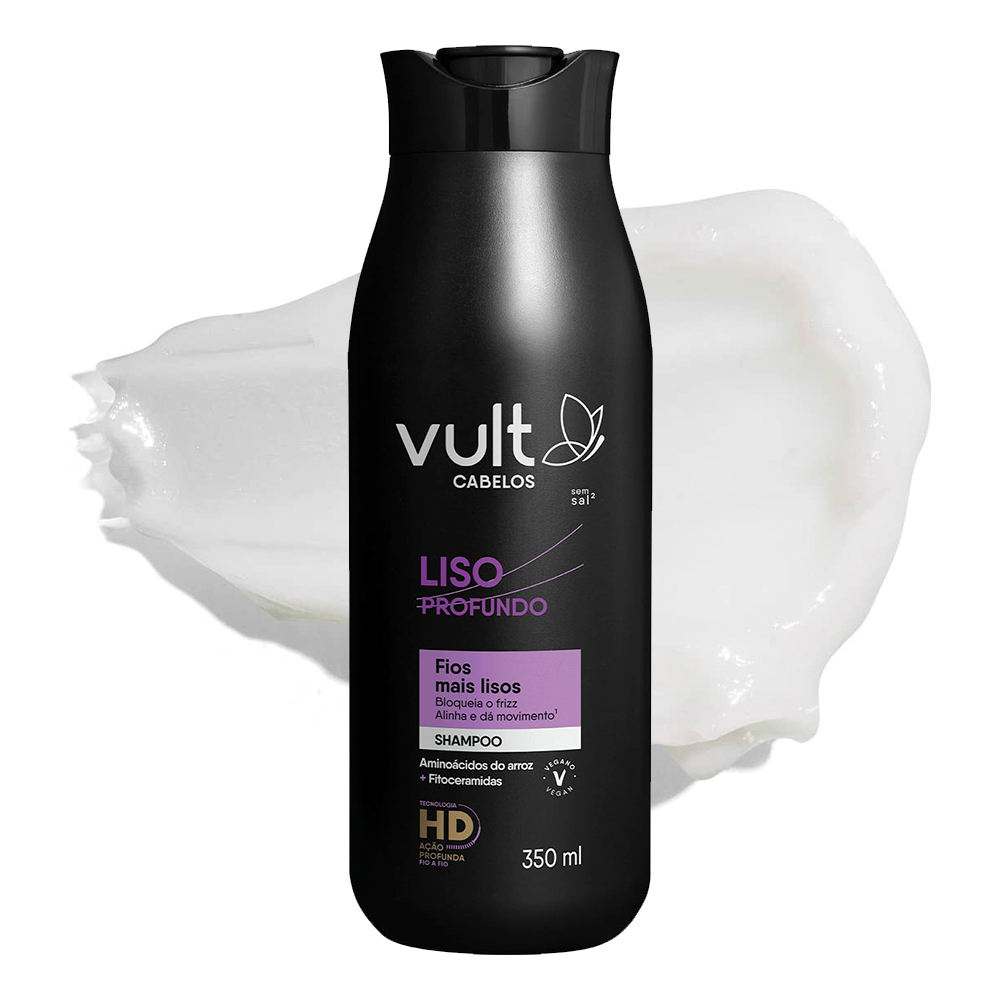 A Tecnologia HD presente na fórmula contém aminoácidos com alto poder reparador, que atuam profundamente na estrutura capilar. A espuma cremosa limpa sem ressecar os fios, evitando o embaraço. O shampoo é vegano e livre de sal, parabenos, petrolatos (óleo mineral e parafina), tornando-o uma opção para quem busca produtos com fórmula mais natural. Para utilizar, aplique o shampoo sobre o cabelo molhado, massageando suavemente o couro cabeludo e os fios. Enxágue bem. Para melhores resultados, utilize a linha completa Vult Cabelos Liso Profundo.