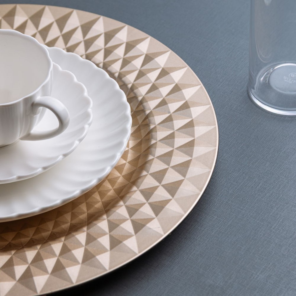 O material plástico confere leveza ao sousplat, simplificando o manuseio e o armazenamento. Sua superfície lisa impede o acúmulo de resíduos e permite a fácil remoção de manchas com um pano úmido. O design com detalhes em relevo nas bordas contribui para um visual diferenciado e ajuda a evitar que o prato deslize.