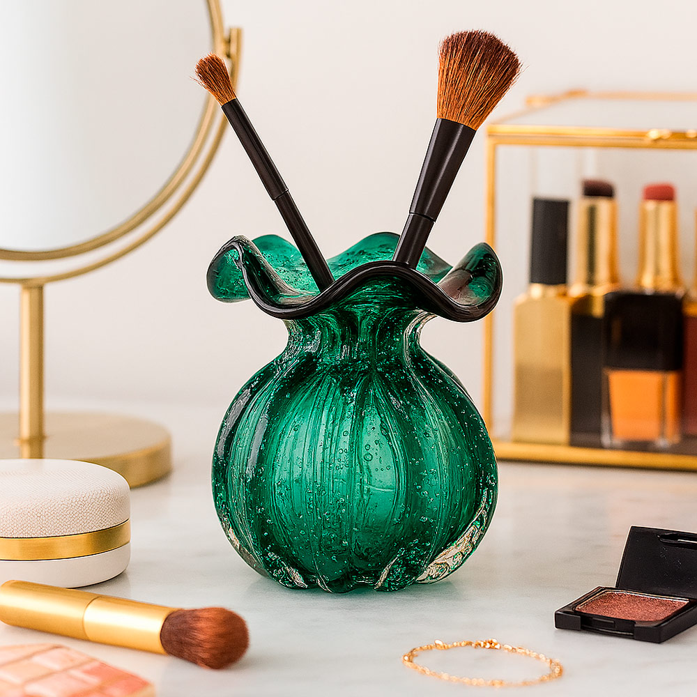 O vaso decorativo em Vidro Murano é ideal para acomodar arranjos florais, plantas de pequeno porte ou como peça de destaque individual. A técnica de produção artesanal, com vidro soprado, resulta em um objeto único, com variações sutis que atestam sua autenticidade. O acabamento translúcido esmeralda permite a passagem de luz, valorizando a cor e as texturas, enquanto as bolhas internas proporcionam um efeito visual diferenciado.