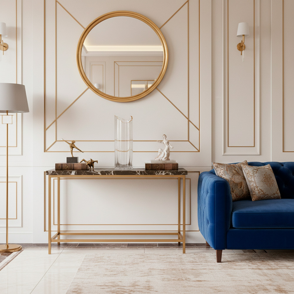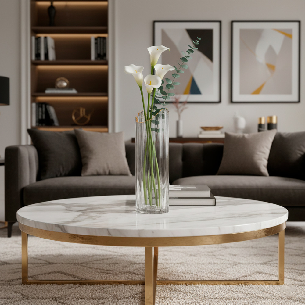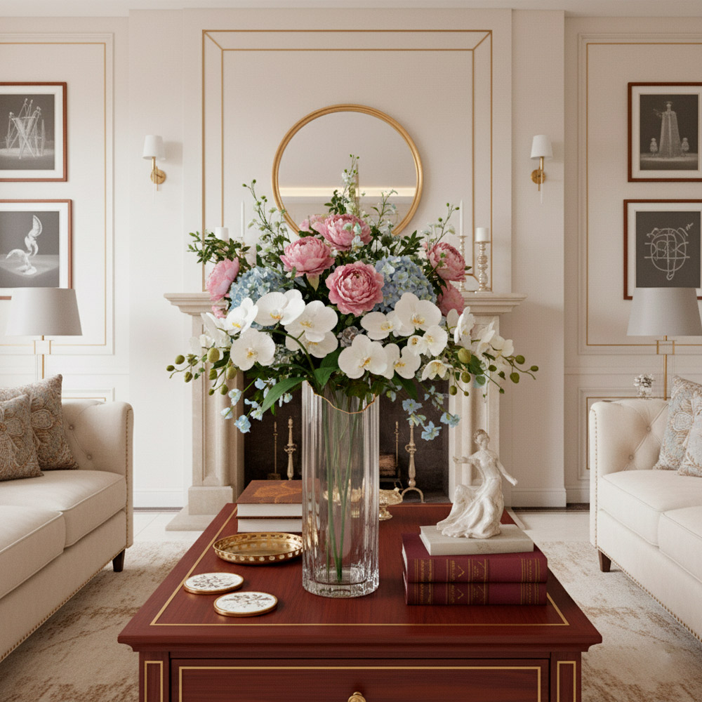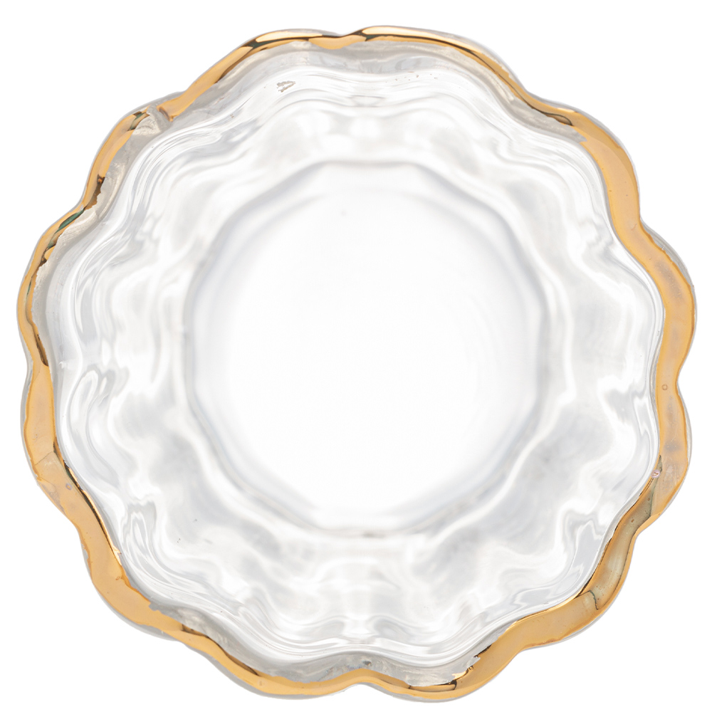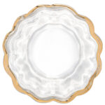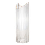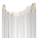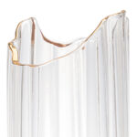 A borda superior do vaso possui um formato ondulado, que auxilia no posicionamento de caules de diferentes comprimentos, e um acabamento dourado, que integra a peça a decorações que utilizam tons metálicos.